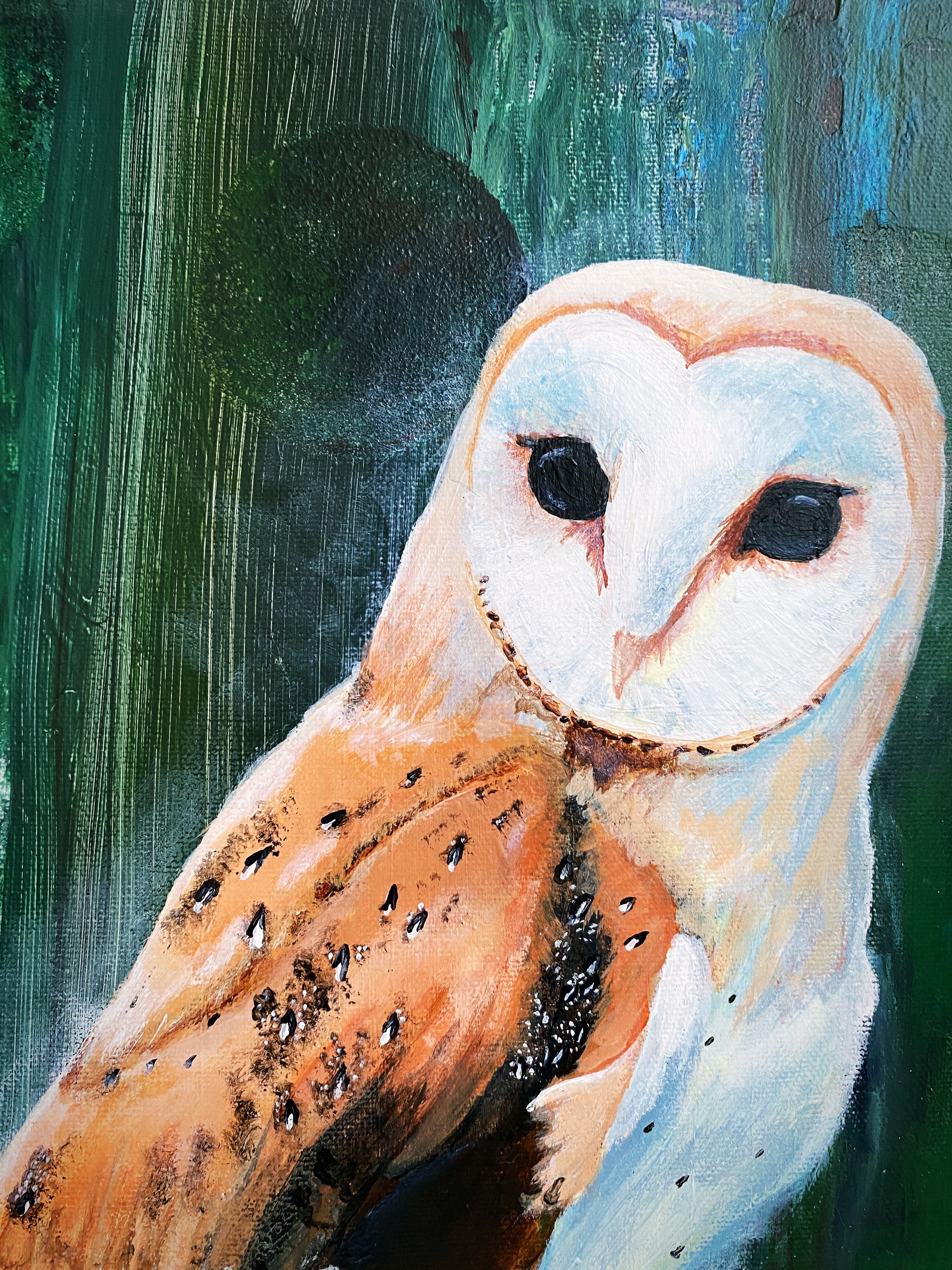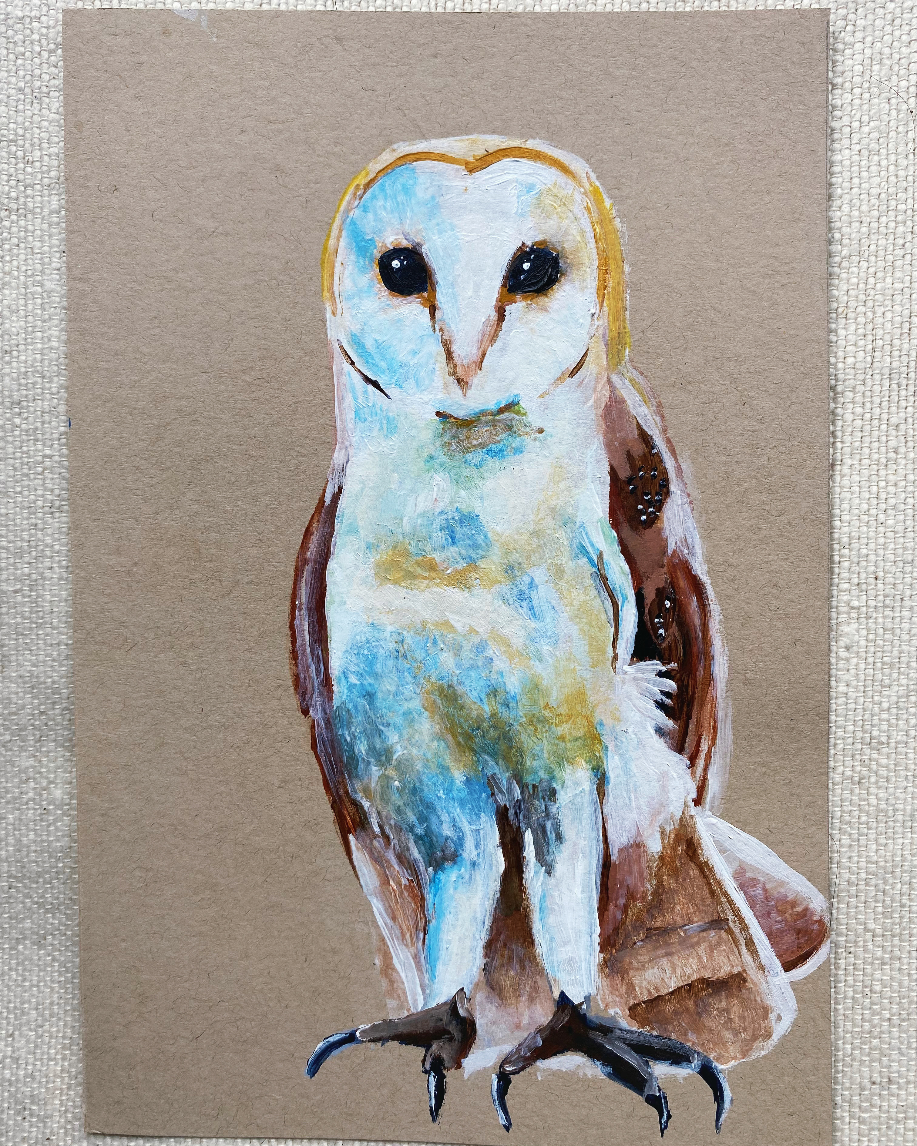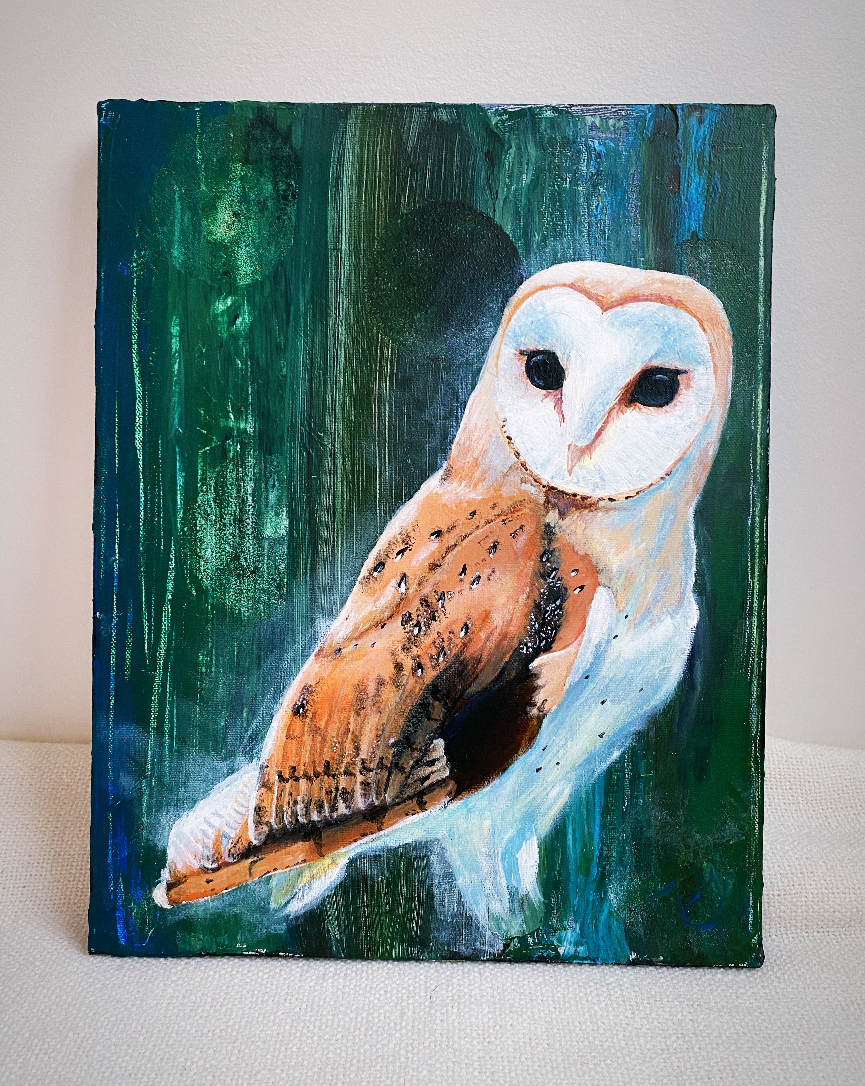 Here, you’ll find original acrylic paintings inspired by the joyful wonders of nature: finding bunches of mushrooms, seeing an owl in a tree, and spotting a woodland friend in the brush.